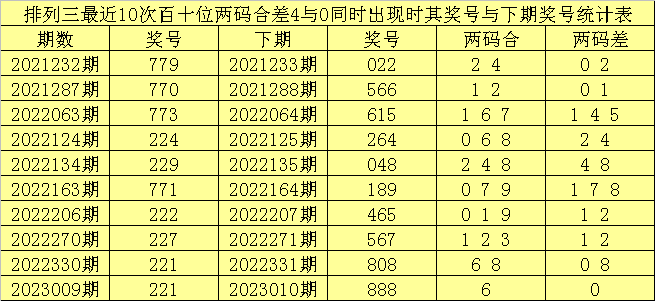 百十位合差分析:上期奖号百十位开出77组合,两码合为4,两码差为0,最近10次百十位两码合4与两码差0同期出当前,其奖号和下期奖号区分为: