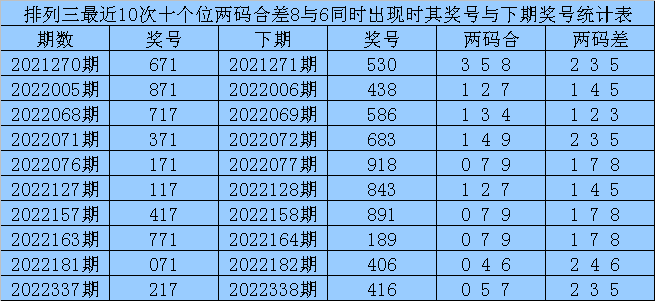 从以上统计不错看出,十个位两码合差8与6同期出现之后其下期两码合差发达最热的4个区分为:1257,本期十个位两码合差不错参考这四码中的数据。