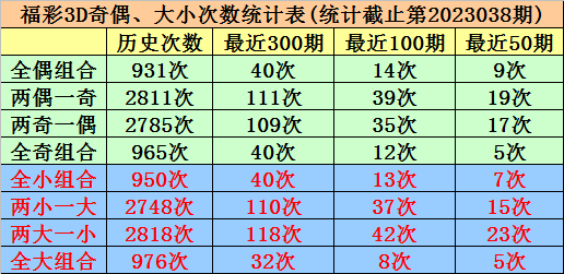 奇偶、大小分析:在最近50期开奖中,全偶组合开出9次,现时遗漏4期、两偶一奇组合开出19次,现时遗漏0期、两奇一偶组合开出17次,现时遗漏7期、全奇组合开出5次,现时遗漏5期,本期难得两偶一奇组合;全小组合出现7期,现时轮空3期、两小一大组合出现15期,现时轮空2期、两大一小组合出现23期,现时轮空0期、全大组合出现5期,现时轮空13期,本期看好开出两大一小组合。