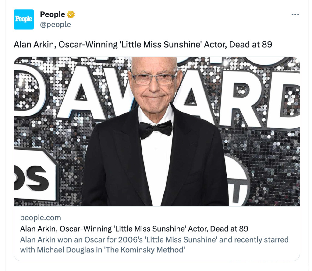 直到2023年7月1日凶讯传来,外媒报谈艾伦·阿金已在家中圆寂,享年89岁,他的男儿们也第一时候阐明了此事。