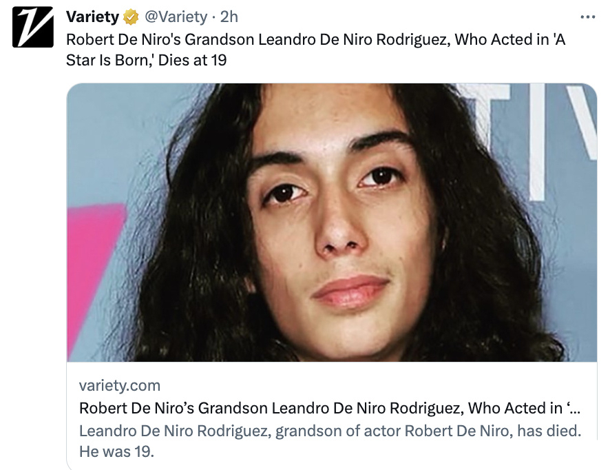 后续,莱安德罗的母亲德雷纳·德尼罗在酬酢平台上公布了男儿的死讯。