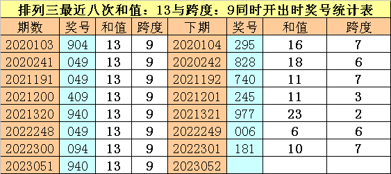 体彩陈列三最近八次同期出现和值:13与跨度:9的奖号分手为:904、049、049、409、940、049、094、940,前七次下期开出奖号分手为:295、828、740、245、977、006、181,详见下表:
