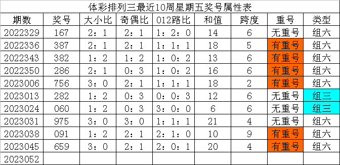 体彩摆设三最近10周星期五奖号别离为:167、387、382、286、756、282、060、975、091、659,各奖号属性详见下表: