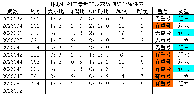 体彩摆设三最近20期双数期奖号别离为:090、901、656、091、334、231、082、885、581、714,各期奖号详备属性下表: