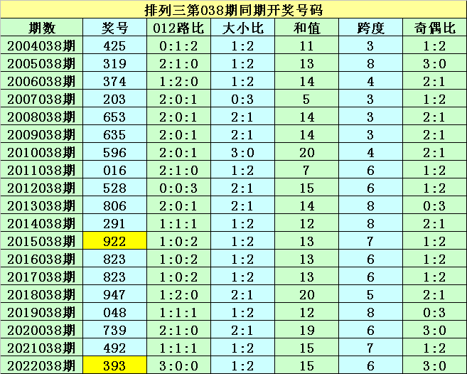 本期为陈列三第2023038期开奖,开奖日历为:2023年2月17日,历史上陈列三第038期已开出了19次奖号,积年同时开出号码鉴别为:425-319-374-203-653-635-596-016-528-806-291-922-823-823-947-048-739-492-393。