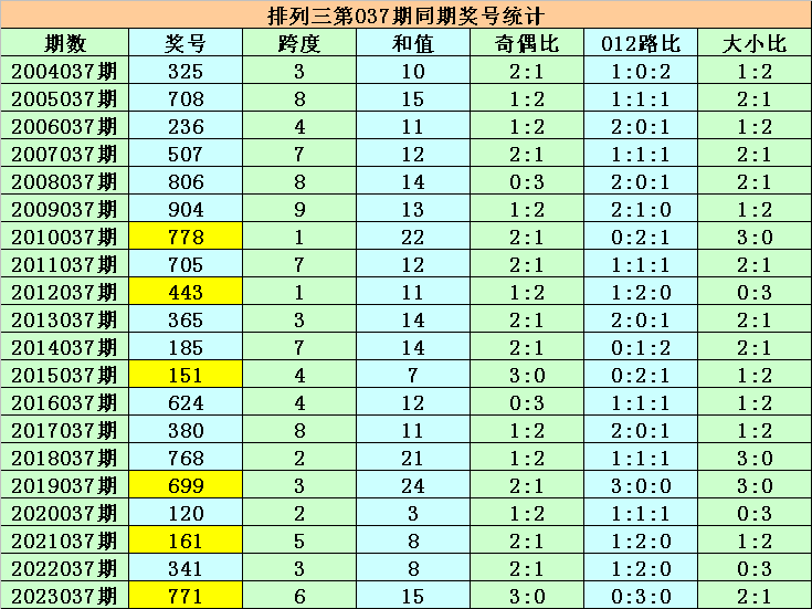 号码012路比:第038期历史同时号码012路比为27:11:19,本期预测012路比开出1:1:1。