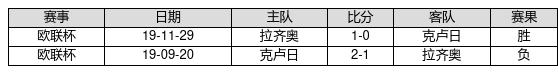 拉皆奥 VS 克卢日两队近10年的交战次数为2场,拉皆奥1胜0平1负,赢球概率为50%,平局概率为0%,输球概率为50%。