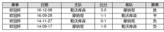 勒沃库森 VS 摩纳哥两队近10年的交战次数为4场,勒沃库森1胜1平2负,赢球概率为25%,皇冠信用网开户平局概率为25%,输球概率为50%。