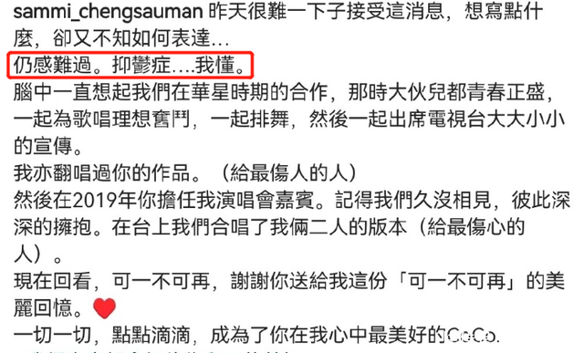 郑秀文在发文怀念李玟的时候曾说,“抑郁症,我懂”。两个字就说念出了她曾患抑郁症的辛酸。