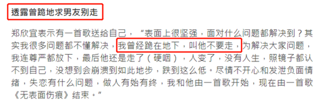 郑欣宜此前曾因为体魄问题深陷错愕,拚命减肥。恋爱不雅也很卑微,曾自曝下跪求男友别走。
