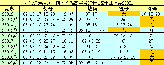 大乐透第23012期-第23021期前区奖号冷温热散布统计: