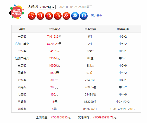 大乐透第2023022期开奖皇冠体育接口,前区:07、11、15、26、28;后区:08、10。其中前区012路比为1:2:2,后区开出2路号码和1路号码。