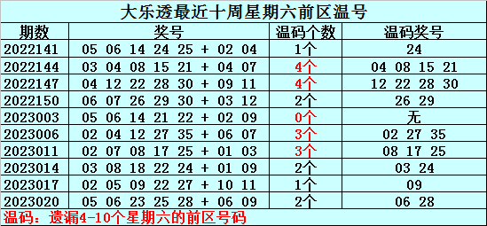 热号:最近十周星期六前区开出21个热号,上周星期六前区开出2个热号,本周星期六赋闲热。